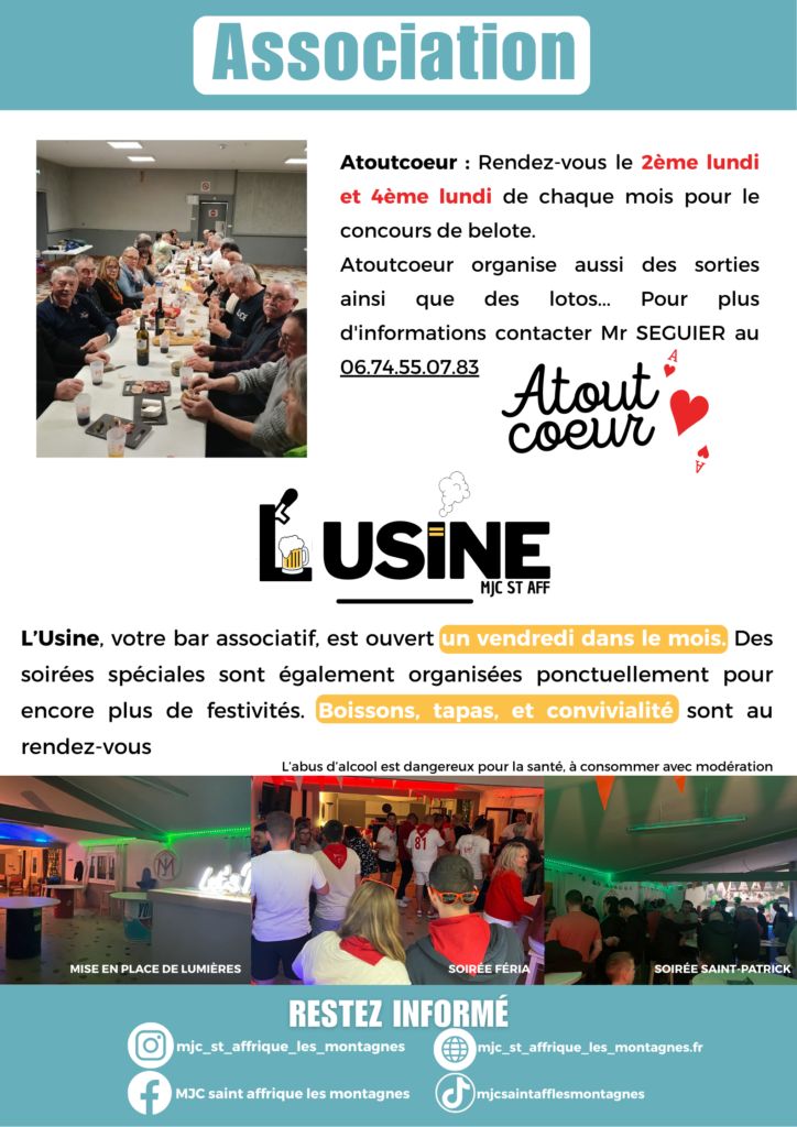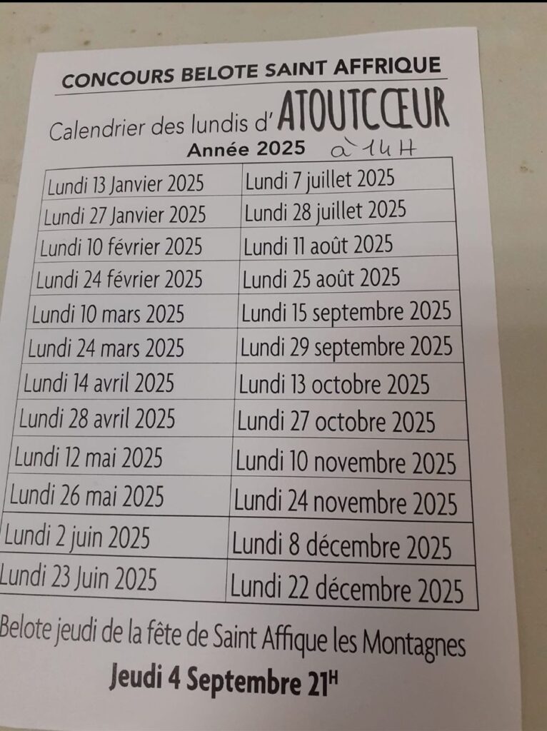 Atout coeur vous accueille chaque deuxième et dernier LUNDI du mois (voir calendrier ci-dessous) pour son concours de belote convivial. En plus de la belote, le club organise régulièrement des sorties et des lotos pour partager des moments agréables entre membres.